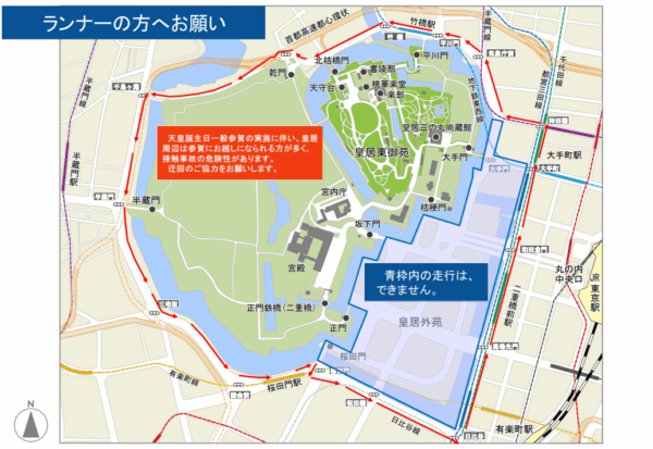 令和8年2月23日(月祝)天皇誕生日一般参賀に伴い、桜田門や皇居外苑あたりの内堀通りは走行禁止になりますので日比谷通りへの迂回をお願いします。